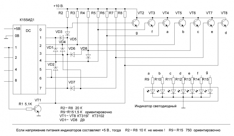 Схема работает очень просто. Все сегменты индикатора стараются светиться, а дешифратор их тушит в соответствии с входным кодом и посредством диодов закрывает транзисторы VТ2, VТ8. Транзистор VT1 тушит сегмент d с каждой нечетной цифрой.