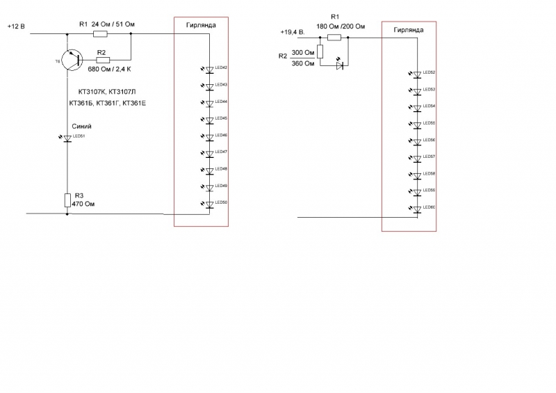 Спасибо. Как я понимаю, в левой схеме синий будет гореть в случае аварии, а в правой постоянно. Мощность R3 имеет значение? Сегодня соберу, померяю, отпишусь.