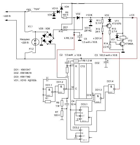 Читал про мой таймер? Во, только что схему нарисовал - теперь от ~220 В. так-же будет работать. Читал где то, что аккумулятор нужно заряжать 10 часов (не знаю насколько это правда). Тебе в аппарат такой не нужен? А то я ему применение придумать не могу, кроме как: пошёл утром на работу ( осенью и зимой у нас утром темно) и свет включил на улице (я в частном доме живу), что бы не сразу в темень выходить. Таймер, потом, свет отключит и сам выключится.