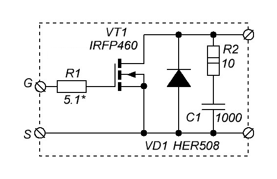 и вместо него подставить мощный полевой МОП-транзистор и небольшой «стандартный» набор пассивных элементов...