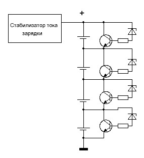 Должен Вам сказать, что это не принципиальная схема. Эта схема объясняет принцип действия. Генератор тока зарядки вырабатывает ток необходимый для зарядки. При этом, напряжение генератора превышает напряжение всех заряженных АКБ. На приведённой схеме нужно, как минимум, соединить эмиттер и базу резистором 1 - 3 кОм каждого транзистора, для их более надёжного закрывания. (Когда напряжение АКБ менее напряжения полной зарядки). Стабилитроны, считаю, лучше применить регулируемые 321е вроде бы. (Если нужно, могу попробовать нарисовать рабочую схему).