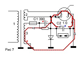 т.к. сопротивление разрядника, пробою, более. Рис 7. Таким образом к магнетрону приложено напряжение от 4 до 6 раз превышающее напряжение L3 и ёмкость С2 в 2560 раз