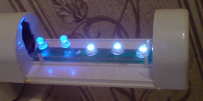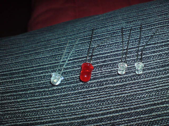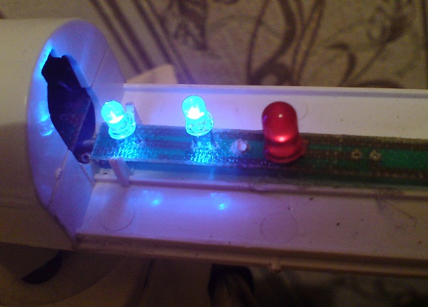 Забыл кондер купить, но зато есть 4 диода- 2 синих, красный и белый. R2 подключил последовательно, с ним белый горел тускловато, без него вообще он горел 3 сек и капец ему. поэтому подключил последовательно 2 синих и красный. Красный больше подходит для индикатора, а не подсветки.