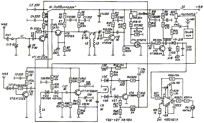 Принцип работы основан на индикации уровня напряжённости электрического поля закладок при удалении или приближении устройства обнаружения к ним. Уровень излучения радио закладок "оценивается по встроенному индикатору. Устройство обнаружения состоит из двух усилителей, один из которых совместно с фильтром обеспечивает контроль в первом поддиапазоне 65-155 МГц, а другой от 155 МГц до 410 МГц во втором поддиапазоне. Первый усилитель собран на транзисторе VT1 с входным фильтром C1,L1,C2 (рис.1), обеспечивающим фильтрацию зеркальных частот выше 155 МГц. Оба усилителя подключены к смесителю на транзисторе VT2 и могут работать только поочередно - каждый со своим гетеродином. Гетеродин, работающий с первым усилителем, собран на транзисторе VT8. Он перекрывает диапазон частот от 155 до 245 МГц.