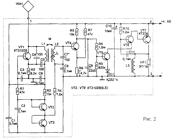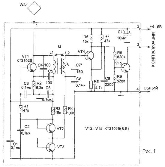 руки к датчику WA1 в колебательный контур автогенератора на транзисторе