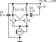 L1, L2 - бескаркасные. Для диапазона 65 - 108МГц диаметр 2,5мм. по 15 витков каждая, провод ПЭВ 0,3. Настройка заключается в подгонке частоты путем сжатия-растяжения. Способен работать на частотах до 2ГГц. Т1, Т2 - КТ368.
