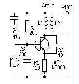 Транзистор КТ368 или КТ3102, микрофон от импортного телефона, магнитофона. Обычно схема работает сразу после включения. В любом случае рекомендую померить напряжение на базе транзистора высокоомным вольтметром, - оно должно быть порядка 1,1-1,2 В. Если же оно другое, то надо подобрать сопротивление R1 пока не будет все как надо.