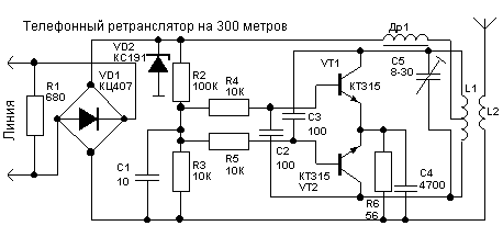 Автогенератор собран по обычной двухтактной схеме на транзисторах VT1 и VT2 типа КТ315. Частотная модуляция происходит за счет изменения напряжения в линии и, как следствие, изменения напряжения на базах транзисторов VT1 и VT2. Частота задается параметрами контура L1, С5. При изменении емкости конденсатора С5 в пределах от 8 до 30 пФ диапазон возможного изменения частоты генератора составляет от 65 до 108 МГц, при постоянной индуктивности катушки L1. Дроссель Др1 - любой индуктивности в диапазоне от 50 до 100 мкГн. Катушка L1 наматывается на корпусе подстроечного конденсатора С5 и содержит 4 витка провода ПЭВ 0,5 мм с отводом от середины. Катушка L2 намотана поверх L1 и имеет 2 витка того же провода. В качестве транзисторов VT1, VT2 можно использовать любые высокочастотные транзисторы. Стабилитрон VD2 - на напряжение 6-12 В. От него зависит мощность и диапазон девиации частоты передатчика. Настройка производится при занятой телефонной линии путем подстройки контура L1, С5.