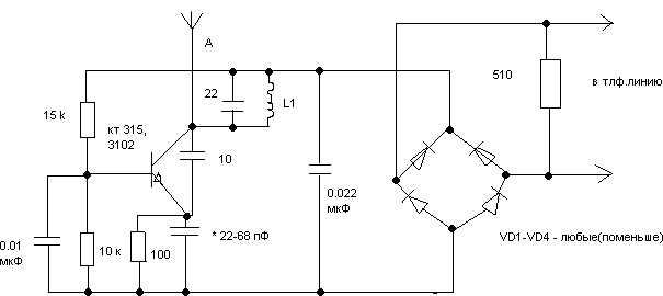 Телефонный жучок с частотной модуляцией. Радиус действия - до 200м. Включается в разрыв любого телефонного провода. Катушка L1 наматывается на сверле диаметром 3мм проводом ПЭВ-0,5 и содержит для диапазона УКВ - 7, а для диапазона FM - 3 витка.