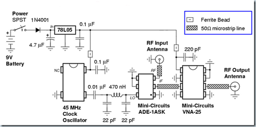 Далее я взял генератор синхросигналов, настроенный на 45 Мгц, на который реагирует порт гетеродина на микросхеме приемника, в результате чего генерируются помехи. Необходимо также сравнять сопротивление в генераторе синхросигналов и порте гетеродинов. Для этого я направил через сеть согласования сопротивлений сигнал от местного генератора электрических колебаний приемника.