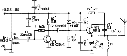 Чувствительность микрофона хватает для уверенного восприятия слабого звука (шепот, тихий разговор) на расстоянии 3...4 метра от микрофона. Дальность действия устройства - около 50 метров (при длине антенны передатчика 30...50 см). Схему передатчика желательно уменьшить до минимальных размеров (чтобы его не было видно). При использовании устройства на небольших расстояниях (до 15 м) питание можно снизить до 1,5...3 В. Питать передатчик желательно от малогабаритных элементов. Ток потребления составляет 3...4 мА. Рабочая частота передатчика - 66...74 Мгц.