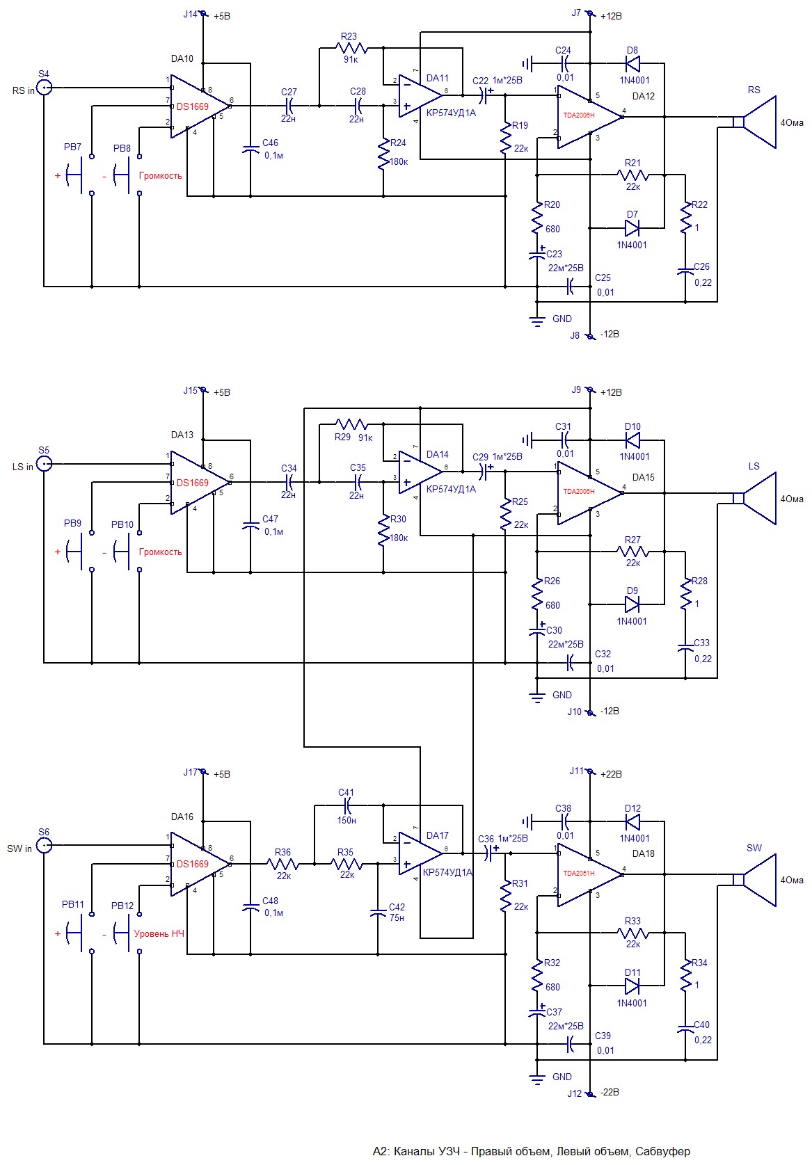 Предлагаю вашему вниманию схему усилителя, для реализации компьютерной акустической системы стандарта 5.1, среднего класса, наподобии Top Device, JetBalance, для подключения к двуполосным АС. Извиняюсь за неправильную последовательность маркировки компонентов, так как идеи по улучшению приходили в процессе разработки. Идею с цифровой кнопочной регулировкой звука, взял со своей акустики Top Device. В промежуточном звене усилителя, установил активные фильтры на ОУ, для защиты оконечных усилителей от перегрузки ненужными частотами и более ровного звучания.