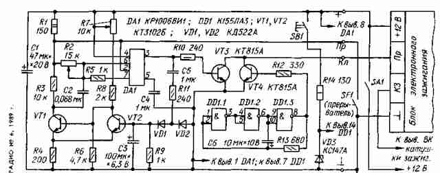 Автогенератор DD1.1-DD1.3 совместно с электронной системой зажигания создает в свечах многоискровой режим, который облегчает запуск холодного двигателя. При нажатии на кнопку SB1 (только при запуске) система зажигания формирует вместо одиночной искры серию искр, следующих с частотой около 50 Гц (при -10° С).