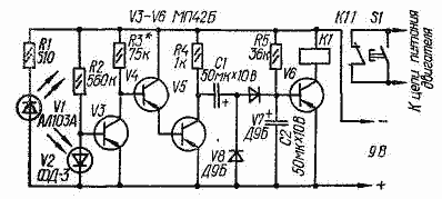 Один из вариантов автостопа - с фотоэлектрическим датчиком. Датчик состоит из светодиода VI и фотодиода V2, между которыми вращается диск подкассетника приемного узла с тремя отверстиями. При отсутствии освещения сопротивление фотодиода V2 велико, поэтому транзистор V3 открыт, а транзисторы V4, V5 закрыты, и напряжение на коллекторе последнего близко к напряжению источника питания. При прохождении участка диска с отверстием фотодиод освещается светодиодом, транзистор V3 закрывается, а транзисторы Vi, V5 открываются, поэтому напряжение на коллекторе транзистора V5 уменьшается до нескольких долей вольта. Таким образом, при нормальной работе лентопротяжного тракта на вход выпрямителя (V7, V8) поступает последовательность импульсов, амплитуда которых близка к напряжению питания. Постоянная составляющая выпрямленного напряжения (положительной - по отношению к общему проводу - полярности) поддерживает закрытым транзистор V6, поэтому реле К1 находится в отпущенном состоянии, и цепь питания двигателя замкнута.