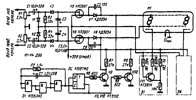 Принципиальная схема устройства показана на рисунке. Оно состоит из входных делителей напряжения сигналов левого (R1) и правого (R2) каналов, двух выпрямителей (V1, V3 и V2, V4), коммутатора (V5, V6), генератора тактовых импульсов (D1, D2, V9, V10), набора (по числу регистрируемых значений мощности) электронных ключей S1-SN и индикатора HI. Контролируемые сигналы с выходов выпрямителей поступают на коммутатор, который поочередно, с частотой около 40 Гц (чтобы не было заметно мерцание сегментов индикатора), подает их на входы электронных ключей S1-SN. Частоту коммутации задает генератор тактовых импульсов, состоящий из собственно генератора на инверторах микросхемы D1, триггера D2, работающего в режиме деления частоты на 2, и ключей на транзисторах V9, V10. Введение триггера D2 обусловлено необходимостью получения противофазных импульсов со скважностью, равной 2 (в противном случае яркость свечения сегментов в каналах была бы неодинаковой). Импульсы с выхода триггера поочередно открывают транзисторы V9, V10, и сегменты индикатора, подключенные к коллектору открытого в данный момент транзистора, оказываются соединенными с общим проводом. Одновременно на сегменты, соединенные с коллектором закрытого транзистора, подается напряжение питания, и те из них. которые расположены под сетками, соединенными с открытыми транзисторами ключей S1--SN, начинают светиться.