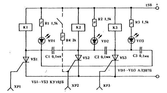 Собранный из исправных деталей переключатель входов налаживания не требует. Устройство легко превратить в псевдосенсорное, если применить замыкающие кнопки (например, КМ-1), подающие с шины +15 В через токоограничительный резистор R4 импульс управления на тиристоры.