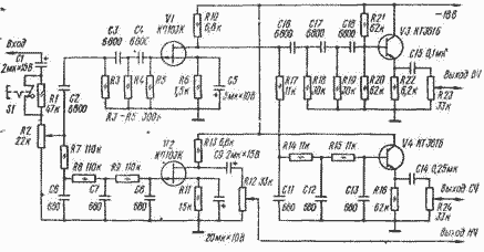 Блок фильтров содержит переключатель уровня сигнала (S1), регулятор громкости (R2), два усилительных каскада (VI, V2) с включенными на входе фильтрами верхних (C2R3C3R4C4R5) и нижних (R7C6R8C7R9C8) частот и два эмиттерных повторителя (V3, V4) также с фильтрами верхних (C16R18C17R19C18R20) и нижних (R17C11R14C12R15C13) частот на входе.