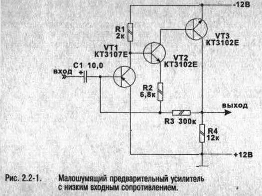 Усилитель на рис. 2.2-1 имеет входное сопротивление 5 Ом, полученное благодаря применению ПОС и ООС в определенных соотношениях. Часть эммитерного сигнала транзистора VT2, поступающего на базу VT1, создает ООС, а коллекторный сигнал VT3 — ПОС. Благодаря низкому входному сопротивлению значительно улучшены шумовые характеристики усилителя. Спектральная плотность собственных шумов при разомкнутом входе составляет 2*10(-4) мкВ/Гц. Коэффициент усиления равен 40. Полоса пропускания определяется емкостью С1. Малошумящий предварительный усилитель с низким входным сопротивлением