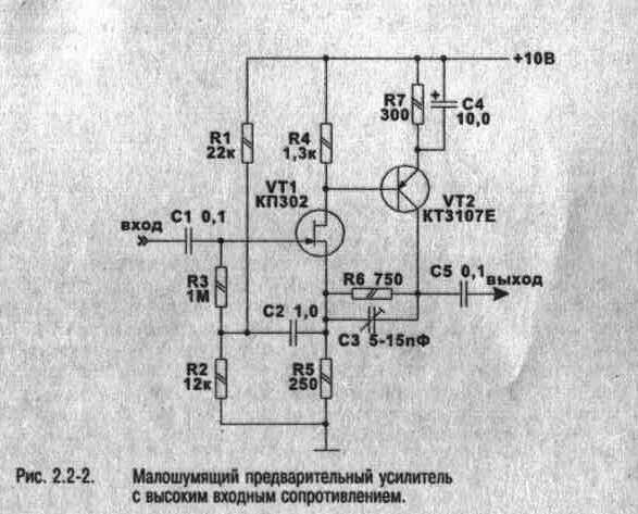 На входе усилителя на рис. 2.2-2 применен полевой транзистор в схеме с ОИ. Второй каскад выполнен на биполярном транзисторе по схеме с ОЭ. В усилителе две петли ООС. С коллектора транзистора VT2 через цепочку R6, СЗ сигнал обратной связи подается в исток полевого транзистора, а с истока через конденсатор С2 и резистор R3 на затвор VT1. Наличие второй ООС позволяет увеличить входное сопротивление усилителя до десятков мегаом и снизить входную емкость. Коэффициент усиления может быть установлен от 1 до 100, при этом изменяется также полоса пропускания. Для коэффициента усилиния равного 4 полоса пропускания лежит в пределах 100Гц-40 МГц. Входное сопротивление 30 МОм, максимальное выходное напряжение 1,5 В.