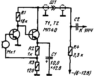 Налаживание микрофонного усилителя сводится к проверке коллекторного напряжения транзистора Т2, оно должно быть равно половине напряжения питания. Если необходимо, в небольших пределах подбирают сопротивление резистора R3, определяющего ток второго каскада усилителя.
