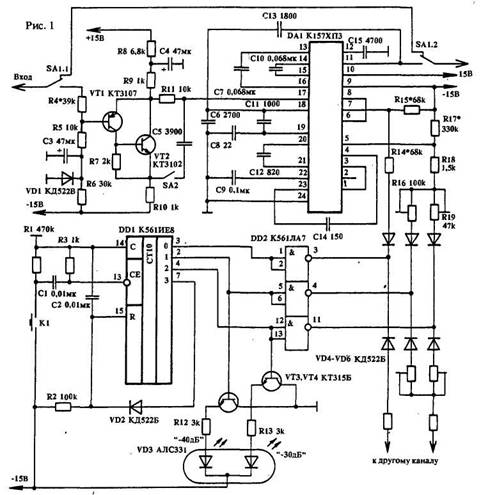Эффективность шумопонижения в значительной степени связана с начальной нижней частотой среза, которая зависит от резистора в цепи вывода 7 и может быть установлена в пределах 0,8...1,6 кГц. Для индикации режима работы использован двухцветный светодиод VD2 (-40 дБ - зеленый, -30 дБ - красный). Микросхема К157ХПЗ включена по типовой схеме и особенностей не имеет.