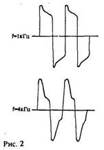На транзисторах VT1, VT2 собран составной эмиттерный повторитель, он же фазовращатель при замкнутых контактах переключателя S2. Применение фазовращателя желательно при обработке сигнала магнитофона, т.к. из-за дифференцирующего действия магнитная головка при воспроизведении вносит фазовые искажения.Наиболее наглядно это видно при воспроизведении сигнала прямоугольной формы. На рис.2 и 3 изображены осциллограммы сигнала частотой 1 и 4 кГц на выходе усилителя воспроизведения соответственно без фазовращателя и с фазовращателем.