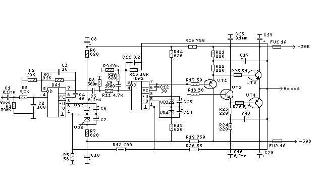 Параметры: -Р вых.ном. 25Вт при R н 8 Ом; -К г не более 0,003%.