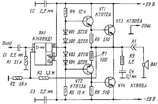 Усилитель напряжения собран на высоковольтном ОУ КР1408УД1 (DA1), предоконечный каскад - на транзисторах разной структуры КТ972А (VT1) , и КТ973А(УТ2), а оконечный усилитель тока - на тран-зисторах КТ908А (VT3, VT4). Функции фазоинвертора выполняет каскад на транзисторе VT2. Усилитель охвачен цепью ООС. Напряжение ООС снимается с его выхода и через делитель R3R2 подается на инвертирующий вход ОУ DA1. Выходное напряжение практически равно напряжению на выходе ОУ. Коэффициент усиления всего устройства K=1+R3/R2. Для устранения искажений типа "ступенька" на базы транзисторов VT1, VT2 подано небольшое напряжение смещения, создаваемое на цепочке диодов VD1-VD4. Ток покоя устройства не превышает 20...30 мА, для его стабилизации диоды VD1-VD4 должны иметь тепловой контакт с теплоотводами транзисторов выходного каскада. Цепь R9C4 предотвращает самовозбуждение усилителя на высших звуковых частотах и при отключении нагрузки. Для этой же цели установлены конденсаторы С2, СЗ. Их необходимо разместить вблизи микросхемы DA1. Все конденсаторы - КМ-6. Диоды Д220 можно заменить любыми высокочастотными, Использовать другие микросхемы и транзисторы не рекомендуется, поскольку это приведет к изменению параметров УМЗЧ.