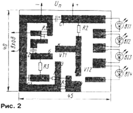 Большинство деталей размещено на печатной плате из односторонне фольгированного стеклотекстолита, эскиз которой показан на рис. 4. Монтаж ведут так же, как описано выше. Плату надо разместить в корпусе подходящих размеров, а для фотодиода сделать отверстие.