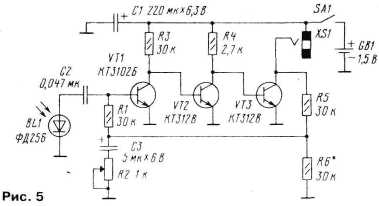 элементов. Прямое или рассеянное ИК излучение от передатчика попадает на фотодиод, и генерирует звуковое напряжение, которое усиливается микросхемой. К ее выходу (гнездо XS1) подключают головные телефоны с сопротивлением постоянному току не менее 50 Ом. Регулировка громкости осуществляется резистором R1, совмещенным с выключателем питания.