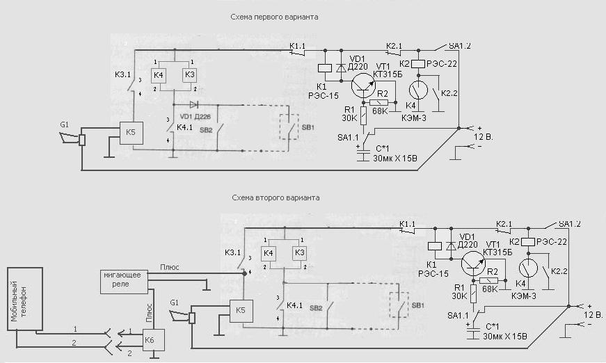 Есть второй вариант с GSM оповещением. Для этого надо найти какую нибудь старую мобилу, я нашел SAMSUNG X100 и припаял две проводки на кнопке для вызова. Потом надо найти реле, который может заставит мигать и звонить, я взял этот реле от МТЗ 80.2 с помощью которого мигает индикатор ручника. Этот реле надо правильно соединить, если правильно не соединишь то он не будет работать. если хочешь сделать этот вариант, то настроишь :). Остальное смотри на схеме: