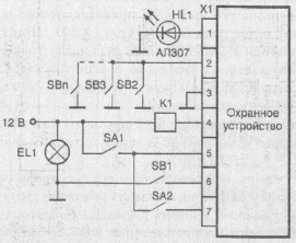 На рис.2 SB1 - выключатель двери водителя (параллельно которому можно подключить датчик качания), SB2 —SBn - выключатели других дверей, капота и крышки багажника, SA1 - тумблер включения питания, SВ2 - переключатель выбора режима работы, EL1 - лампа плафона, HL1 — светодиодный индикатор сторожевого режима, К1 - реле звукового сигнала автомобиля.