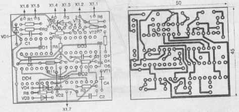 Автосторож собран на двухсторонней печатной плате из фольгированного стеклотекстолита размером 50x45 мм. Чертеж платы приведен на рис.4. При монтаже деталей на плату будьте внимательны — некоторые точки необходимо пропаять с обеих ее сторон.