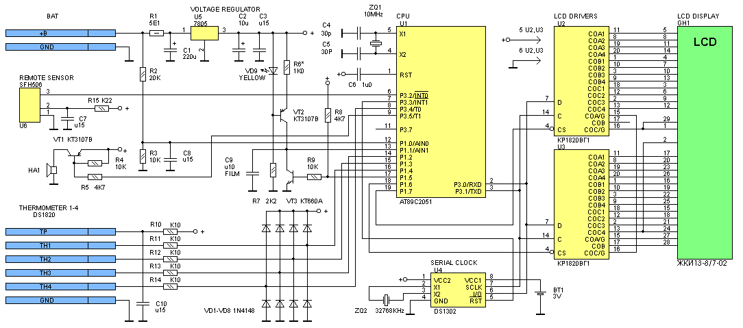 В качестве ИК приемника использована интегральная микросхема SFH-506 фирмы Siemens. Эта микросхема весьма чувствительна к помехам по цепи питания, поэтому применен RC фильтр R15 C7. В случае срабатывания будильника, превышения температурой установленного порога или понижения напряжения в бортовой сети формируется звуковой сигнал. Для его формирования использована малогабаритная динамическая головка HA1, которая подключена через транзисторный ключ VT1. Звуковые сигналы также формируются при нажатиях на кнопки управления. Для питания устройства используется интегральный стабилизатор U5 типа 7805. Потребляемый устройством ток очень небольшой, поэтому радиатор для этой микросхемы не нужен. Поскольку микросхемы контроллера ЖКИ требуют небольшого количества сигналов для связи с микроконтроллером, индикатор можно выполнить конструктивно в отдельном корпусе минимального размера и расположить его в удобном для обозрения месте. Провода датчиков температуры могут иметь длину несколько метров. При этом обязательно должен присутствовать земляной провод. Использовать в качестве земли кузов автомобиля нежелательно. Удобно для термометров использовать аудио кабель, который имеет два провода в общем экране, изолированном снаружи. Полную версию этой статьи можно найти в журнале "Схемотехника", №3 за 2001 год. Литература: Е. А. Иванюта, Н. И. Климович, В. А. Кособрюхов. Микросхема КР1820ВГ1 для управления мультиплексным ЖК-индикатором. <Микропроцессорные средства и системы>, №3, 1990, стр. 4 - 7.