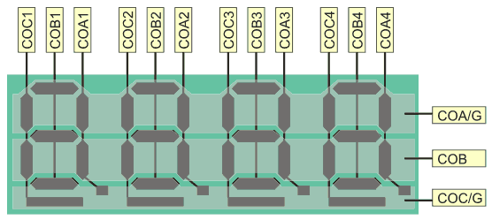 Рисунок 3. Конфигурация сегментов ЖКИ. На рис. 3 показан пример конфигурации ЖКИ, а в таблице 2 показан порядок следования битов в кодовой посылке для этого варианта подключения такого ЖКИ. Таблица 2.