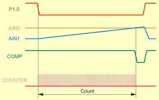 Чтобы записать во внутренние регистры-защелки новые данные, нет необходимости сбрасывать обе схемы: достаточно записать данные по очереди во внутренние регистры-защелки каждой схемы. При этом в последний бит D39 должен записываться ноль как для старшей, так и для младшей схем. Нужно сказать, что некоторые типы ЖК индикаторов неудовлетворительно работают при питании микросхем драйверов напряжением 5В. Однако картина резко улучшается при снижении напряжения питания до 3.3 - 4.0В. Это сделать совсем несложно, так как потребляемый драйверами ток очень мал. В цепь питания можно включить параметрический стабилизатор напряжения на основе TL431 или даже простой резистивный делитель. На всех цифровых входах драйверов также понадобятся делители напряжения. В качестве часов реального времени применена микросхема DS1302 фирмы Dallas. Эта микросхема имеет раздельные входы для подключения основного и резервного источников питания, что избавляет от проектирования довольно хитрых схем перехода на резервный источник. Кроме того, имеется встроенная схема <капельной> зарядки резервного источника питания, которая может быть включена программно. Дополнительно микросхема имеет ОЗУ объемом 31 байт, которое может быть использовано для энергонезависимого хранения параметров. Из навесных элементов требуется только кварцевый резонатор. Здесь хочется предостеречь от применения дешевых некачественных резонаторов. Согласно рекомендациям фирмы Dallas, требуется резонатор, рассчитанный на емкость нагрузки 6 пФ. В противном случае точность хода часов будет неудовлетворительной или даже появятся проблемы с запуском кварцевого генератора. Для обмена с микросхемой DS1302 используются общие с драйверами ЖКИ линии данных и тактирования. Разделены только сигналы CS и RST. К сожалению, микросхема DS1302 имеет довольно специфический 3-х проводный интерфейс, который в фирменной документации описан весьма неоднозначно. Это довольно редкий пример плохого фирменного описания. Поэтому в новых разработках лучше применять более современные микросхемы, например DS1307 с интерфейсом I2C. В качестве датчиков температуры применены микросхемы цифровых термометров DS1821 фирмы Dallas. В цепях данных термометров включены защитные цепочки R11-R14, VD1-VD8, а в цепи питания включен ограничивающий резистор R10 для защиты от короткого замыкания. Несмотря на то, что аппаратно имеется возможность подключить четыре термометра, данная версия программы работает только с тремя. Это вызвано недостаточным объемом памяти программ. Термометры устанавливаются в разных местах автомобиля. В данном случае они были установлены в салоне, на открытом воздухе и в моторном отсеке. Благодаря наличию заданных программно порогов, кроме индикации температуры осуществляется ещё и контроль ее выхода за безопасные пределы. Ввиду недостаточного объема памяти программ, редактирование порогов температур не поддерживается. Пороги в виде констант внесены в текст программы. Для первого термометра +55 градусов, а для второго и третьего термометра +99 градусов. Для измерения напряжения бортовой сети построен простейший 8-разрядный АЦП на основе встроенного в микроконтроллер компаратора. Для уменьшения влияния помех используется 16-кратное усреднение результатов. Принцип работы АЦП пояснен на рис. 4.