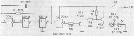 После заряда конденсатора С11 сигнал поступает на вывод 8 триггера на элементах DD1.3, DD1.4, который на выводе 11 формирует положительный импульс, поступающий на выводы 5, 9 микросхемы DD2, и обнуляет счетчик. Момент выключения устройства индицирует светодиод HL1.