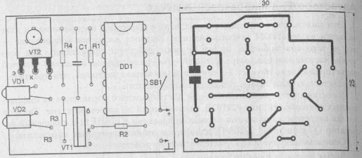 Принципиальная схема пульта дистанционного управления приведена на рис.1. Пульт включает в себя мультивибратор на элементах DD1.1-DD1.3, инвертор DD1.4, импульсный ключ на транзисторах VT1, VT2 и инфракрасные светоизлучающие диоды VD1, VD2. Регулировка частоты мультивибратора осуществляется подбором сопротивления резистора R1. Печатная плата пульта управления приведена на рис.2. Для питания пульта можно использовать батарею "Крона", что обеспечит длительное его использование.