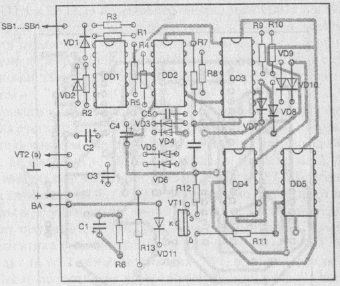 В схеме вместо микросхем серии К561 можно использовать аналогичные микросхемы серии К564, но это потребует изменения рисунка печатной платы. Счетчик К561ИЕ10 можно заменить на два любых других двоичных счетчика этой серии, например К561ИЕ11. Конденсаторы С2, СЗ и С4 желательно использовать с малым гоком утечки, например типа К53-4 или К50-35. Расположение элементов автосторожа на печатной плате приведено на рис.3. Транзистор VT2 монтируется отдельно на радиаторе охлаждения и соединяется с платой сторожа и сигнальным устройством ВА многожильным проводом.