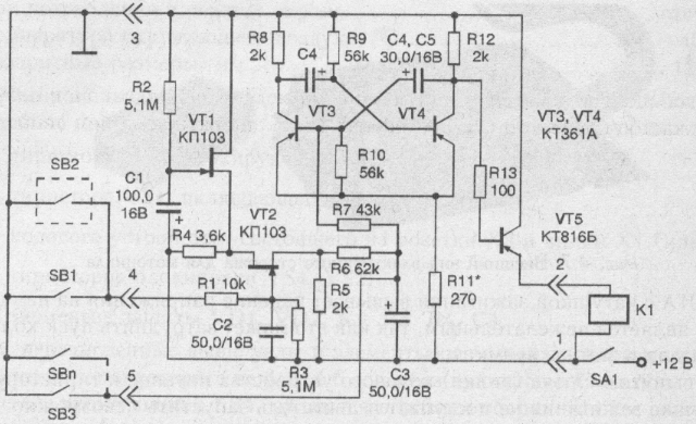 его. Ток, протекающий через резистор R1, быстро заряжает "запоминающий" конденсатор С2, который в течение 1 —2 мин будет поддерживать транзистор VT2 в открытом состоянии, даже если разомкнуть контакты выключателя SB1 и датчика SB2. Ток, протекающий через открытый транзистор VT2 и резистор R6, заряжает конденсатор СЗ. За время 5 — 7 с напряжение на нем достигает 4 В. Если за это время тумблер SA1 не будет выключен, то мультивибратор, собранный на транзисторах VT3, VT4, из заторможенного состояния перейдет в автоколебательный режим. При этом электронный ключ на транзисторе VT5 будет периодически включать реле звуковых сигналов К1. Контактами этого реле включается штатное сигнальное устройство автомобиля.