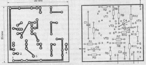 Устройство выполнено на печатной плате размером 35x35 мм из одностороннего фольгированного стеклотекстолита или гетинакса. Печатная плата и размещение на ней элементов устройства представлены на рис.2.