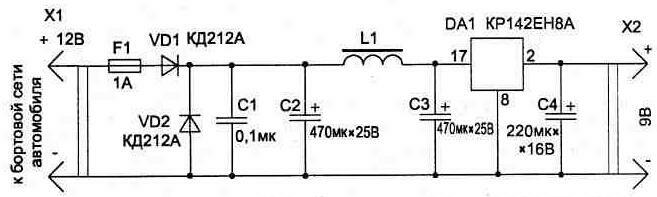 Рис. 4.15. Схема источника питания радиоаппаратуры от электросети автомобиля