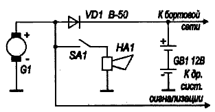 Принципиальная схема сторожа, приведенная на рис. 147, чрезвычайно проста. Здесь G1 - электрогенератор автомобиля; НА1 - клаксон или специальный ревун; SA1 - тумблер включения - выключения сторожа; VD1 - мощный диод (прямой ток не менее 25 A); GB1 - аккумулятор автомобиля.