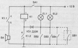 В автомобильном стороже используется реле К1 на напряжение 12 В с двумя парами замыкающих контактов. Диод VD1 предназначен для защиты контактов реле К1 от повреждения при протекании через них большого тока ламп EL1 и EL2 плафонов салона. Диод может быть любого типа на ток не менее 100 мА и напряжение 15 В, например Д226, Д237, КД5Ю, КД522. Недостатком простого автомобильного сторожа является то, что тумблер SA1, которым он включается и выключается, находится снаружи автомобиля, и звуковой сигнал не выключается автоматически.