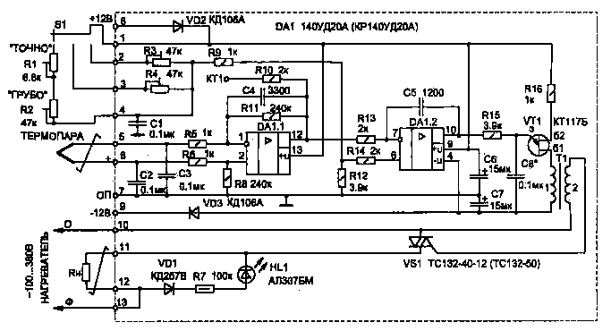 В схеме применена прецизионная микросхема, и замена ее на другой тип недопустима, так как это ухудшит точность поддержания температуры из-за увеличения дрейфа нуля, который будет соизмерим с величиной сигнала от термопары.