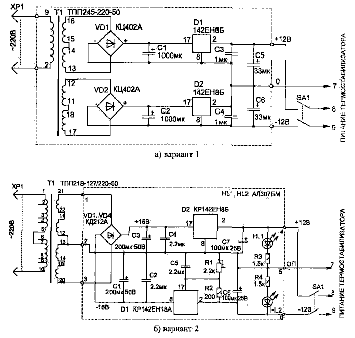 Электрическая схема блока питания термостабилизатора может быть собрана по одному из приведенных на рис. 3 вариантов. Обе схемы имеют внутреннюю электронную защиту от перегрузки и в особых пояснениях не нуждаются, так как являются типовыми. При использовании одного источника питания для нескольких термостабилизаторов включение каждой схемы управления производится отдельным тумблером.