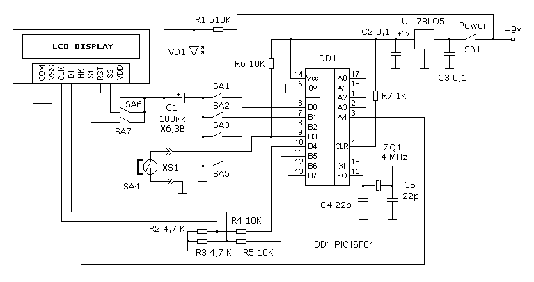 Детали. ЖКИ индикатор десятиразрядный со встроенным контроллером HT1610 от импортных телефонов. Светодиод VD1 малогабаритный, красного свечения. Подойдут любые модификации контроллера PIC16F84 в DIP корпусе. Кнопки малогабаритные мембранного типа. Кварцевый резонатор лучше применить с тремя выводами, он со встроенными конденсаторами, при его использовании C4 и C5 не нужны. Частота кварца несущественна, она может находиться в пределах 3,5-4,5 МГц и корректируется программно при наладке. Для подключения датчика использован разъем который обычно служит для подключения наушников. Все пассивные компоненты типа SMD (компоненты для поверхностного монтажа) использованы в целях уменьшения габаритов конструкции.
