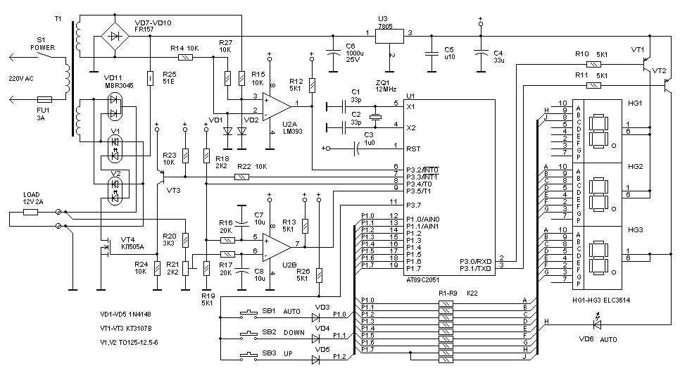 Этот регулятор схемотехнически очень похож на описанный выше, поэтому имеет смысл остановиться только на его отличиях. Поскольку имеющихся портов ввода-вывода микроконтроллера оказалось недостаточно, пришлось отказаться от использования встроенного компаратора. В регуляторе применен сдвоенный компаратор U2 типа LM393. Первая половинка компаратора используется для привязки к сетевому напряжению. Из-за особенностей LM393 в схему привязки пришлось добавить резистор R27, который совместно с R14, R15 образует делитель напряжения, уменьшающий отрицательное напряжение на входах компаратора. Меандр сетевой частоты с выхода компаратора поступает на вход микроконтроллера INT0. Вторая половинка компаратора используется в петле обратной связи. Однобитный сигнал ошибки поступает на вход микроконтроллера T1. На входах компаратора установлены ФНЧ, образованные элементами R16, C7 и R17, C8. Сигнал с выхода модулятора (вывод T0 микроконтроллера) поступает на вход ФНЧ через делитель R18, R19. Делитель необходим по той причине, что компаратор не может работать с входными напряжениями, близкими к напряжению питания. После делителя импульсы имеют амплитуду около 3,5 В. Стабильность амплитуды определяется стабильностью напряжения питания +5 В, которое использовано в качестве опорного. Напряжение, снимаемое с нагрузки, поступает на вход другого ФНЧ также через делитель, образованный резисторами R20, R21. Этот делитель выбирается таким образом, чтобы при номинальном напряжении сети и мощности в нагрузке 100% напряжение на выходе ФНЧ составляло 3,5 В. Сигнал с выхода микроконтроллера INT1 через транзисторный ключ поступает на управление тиристорами. Оптотиристоры V1 и V2 вместе с диодной сборкой VD11 образуют управляемый выпрямитель, который и питает нагрузку. Кнопки управления для экономии портов микроконтроллера включены по-другому. В цикле работы регулятора есть промежуток, когда индикаторы погашены. В это время оказалось возможным провести сканирование кнопок, используя линии данных индикаторов. Таким образом, три кнопки используют дополнительно только одну линию: это линия возврата P3.7. Третья кнопка понадобилась для управления режимом "AUTO". Сразу после включения регулятор находится в ручном режиме, т.е. функционально соответствует регулятору, описанному выше. Для включения режима автоматического регулирования необходимо нажать одновременно кнопки "AUTO" и "UP". При этом зажигается светодиод "AUTO". В таком режиме регулятор автоматически поддерживает установленную мощность. Если теперь нажать и удерживать кнопку "AUTO", то на индикаторах можно посмотреть текущее состояние регулятора (проценты выходной мощности, которые изменяются при колебаниях сетевого напряжения так, чтобы мощность оставалась неизменной). Если сетевое напряжение упало настолько, что поддерживать мощность нет возможности, то начинает мигать светодиод "AUTO". Выключить режим автоматического регулирования можно одновременным нажатием кнопок "AUTO" и "DOWN". При токе нагрузки более 2 А оптотиристоры необходимо установить на теплоотвод. Основания оптотиристоров соединены с анодами, поэтому в данной схеме приборы можно монтировать на общем радиаторе, который соединен с общим проводом устройства. В качестве VD11 желательно применить сборку диодов Шоттки (или два отдельных диода Шоттки, например КД2998). В кра
