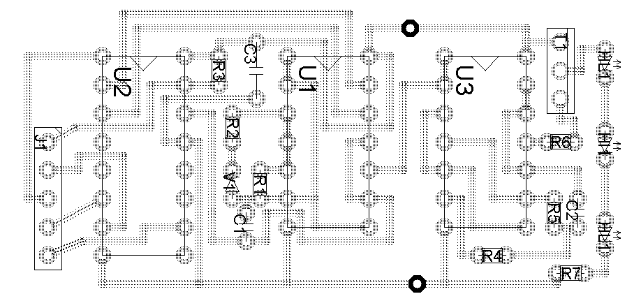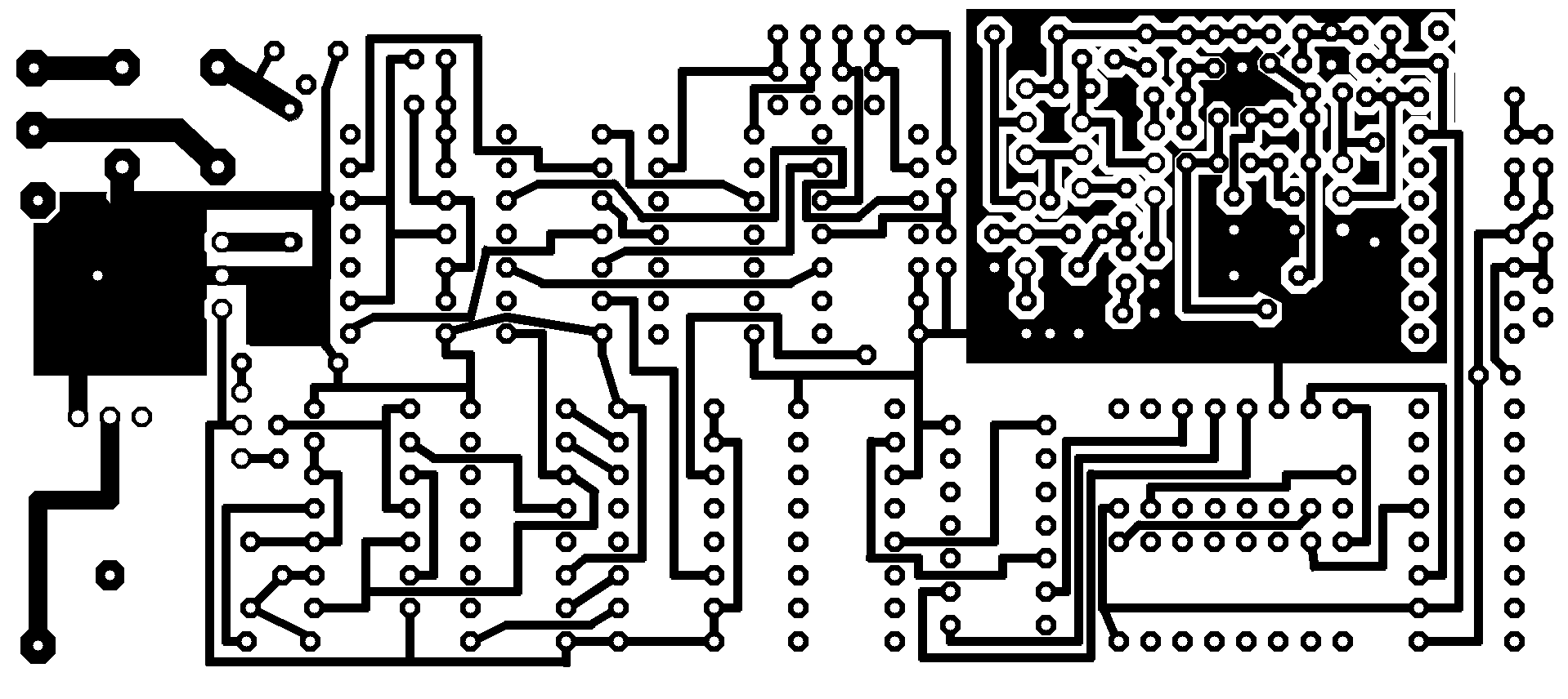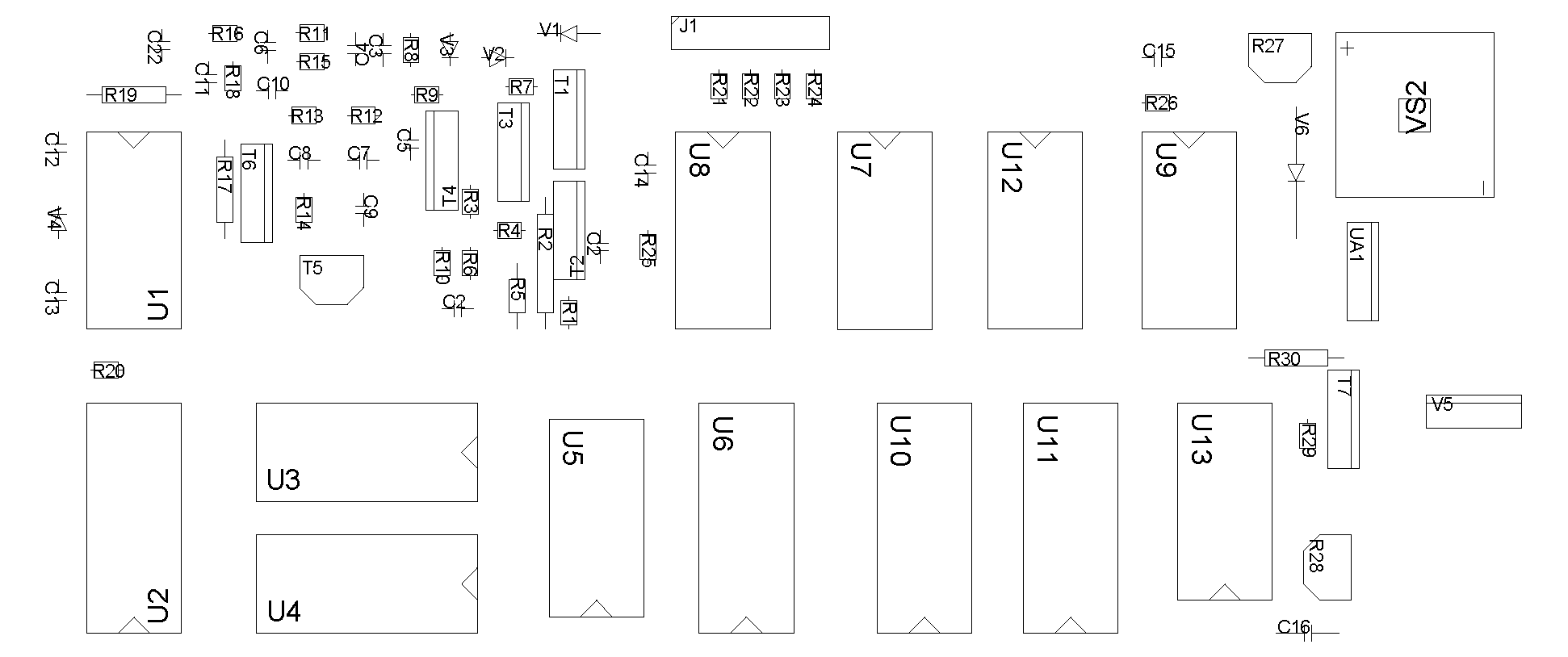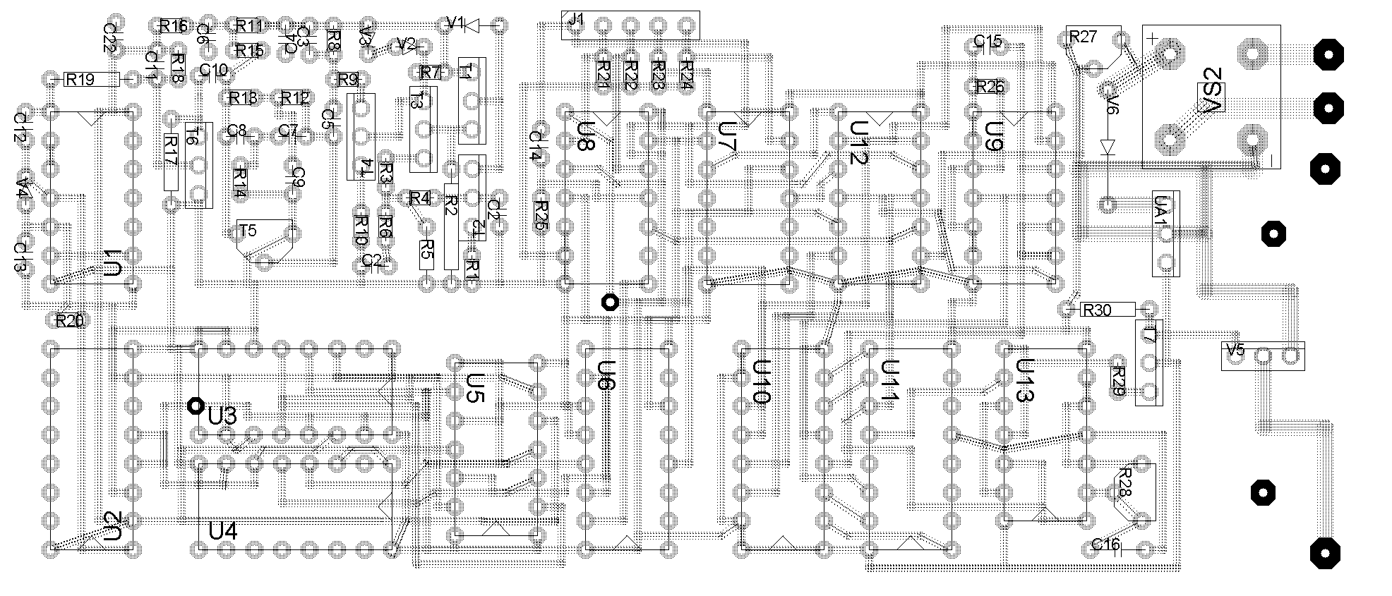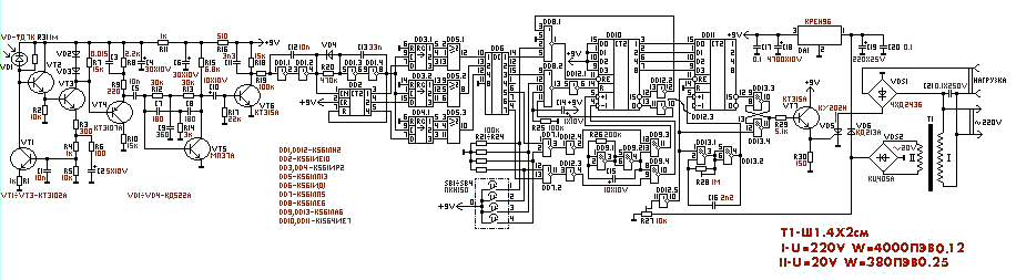 Приёмник.Приемник (рис.3) собран по классической схеме принятой в российской промышленности (в частности в телевизорах Рубин, Темп и т.п.). Импульсы ИК-излучения попадают на ИК фотодиод VD1 , преобразуются в электрические сигналы и усиливаются транзисторами VT3, VT4, которые включены по схеме с общем эмиттером. На транзисторе VT2 собран эмиттерный повторитель, согласующий сопротивление динамической нагрузки фотодиода VD1 и транзистора VT1 с входным сопротивлением усилительного каскада на транзисторе VT3. Диоды VD2,VD3 предохраняют импульсный усилитель на транзисторе VT4 от перегрузок. Все входные усилительные каскады приемника охвачены глубокой обратной связью по току. Это обеспечивает постоянное положение рабочей точки транзисторов независимо от внешнего уровня засветки - своего рода автоматическую регулировку усиления. Особенно важную при работе приемника в помещениях с искусственным освежением или на улице при ярком дневном свете, когда уровень посторонних ИК-излучений очень высок. Далее сигнал проходит через активный фильтр с двойным Т-образным мостом, собранный на транзисторе VT5, резисторах R12-R14 и конденсаторах C7-C9. Он очищает сигнал кодовой посылки от помех сети переменного тока, которые излучаются электрическими лампами. Лампы создают модулированный поток излучения с частотой 100 Гц. и не только видимой части спектра, но и в ИК области. Отфильтрованный сигнал кодовой посылки формируется на транзисторе VT6 . Несущая частота уже не нужна и подавляется с помощью простейшего RS - фильтра на R18, C14. В результате получается сигнал, полностью идентичный тому, что снимался с выхода шифратора команд. Пачки входных импульсов отрицательной полярности поступают на формирователь, собранный на элементах R1, C1, DD1.1. Такой формирователь обладает свойствами интегрирующей цепочки и триггера Шмита. На его выходе импульсы имеют крутые фронты независимо от крутизны фронтов на входе. Кроме того, он подавляет импульсные помехи малой длительности. С выхода элемента DD1.1 импульсы поступают на детектор паузы. Он собран на элементах R20, C13, VD4, DD1.2. Так же, как и DD1.1, DD1.3, элемент Исключающее ИЛИ" DD1.2 работает как усилитель - повторитель сигнала, поскольку один из его входов соединен с общим проводом. Детектор паузы работает следующим обвозом. Первый отрицательный импульс пачки, проходя через диод VD4 на вход элемента DD1.2, переключает его в состояние 0. В паузе между соседними импульсами происходит постепенный заряд конденсатора C13 током, текущем через резистор R20, напряжение на входе DD1.2 при этом, однако, не доходит до порога переключения этого элемента. Каждый последующий импульс через диод VD4 быстро разрежает конденсатор C2, поэтому во время действия пачки на выходе DD1.2 будет логическая 0. В паузе между пачками напряжение на входе 5 DD1.2 достигает порога переключения, этот элемент переключается лавинообразно за счет положительной обратной связи через конденсатор C13 в состояние 1. В результате в паузе между пачками на выходе 10 элемента DD1.2 формируется положительный импульс (четвертая диаграмма рис.4), сбрасывающий счетчик на микросхеме DD2 в 0. Импульсы с выхода формирователя DD1.1 поступаю также на счетный выход CN счетчика DD2, в результате чего после окончания пачки счетчик устанавливается в состояния, соответствующие числу импульсов в пачке (а значит номеру команды). В ка