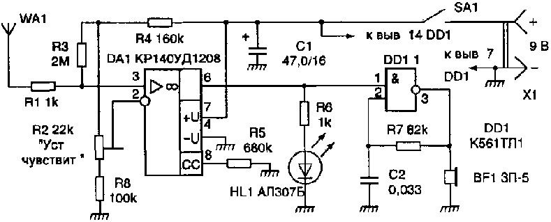 При расположении антенны WA1 вблизи от токонесущего провода электросети наводка ЭДС промышленной частоты 50 Гц усиливается микросхемой DA1, в результате чего зажигается светодиод HL1. Это же выходное напряжение операционного усилителя, пульсирующее с частотой 50 Гц, запускает генератор звуковой частоты.